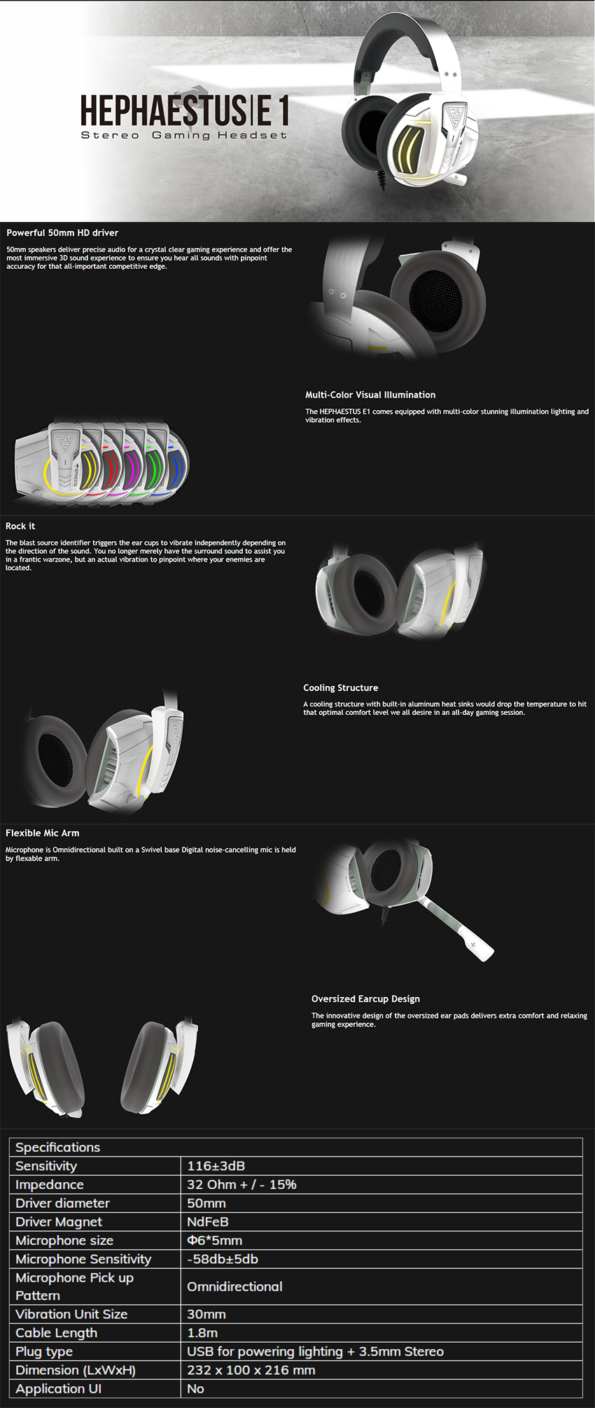 HEPHAESTUS E1 features multi-color illumination and powerful 50mm HD driver unit for exceptionally-tuned audio.FEATURES