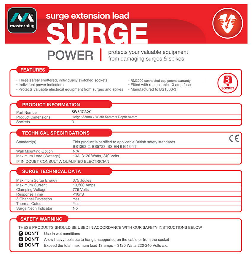 Masterplug Surge Protector 3 Gang 2 Meter 13Amp Switched Extension Lead Compact Vertically Sockets Power SWSRG32C-MPA